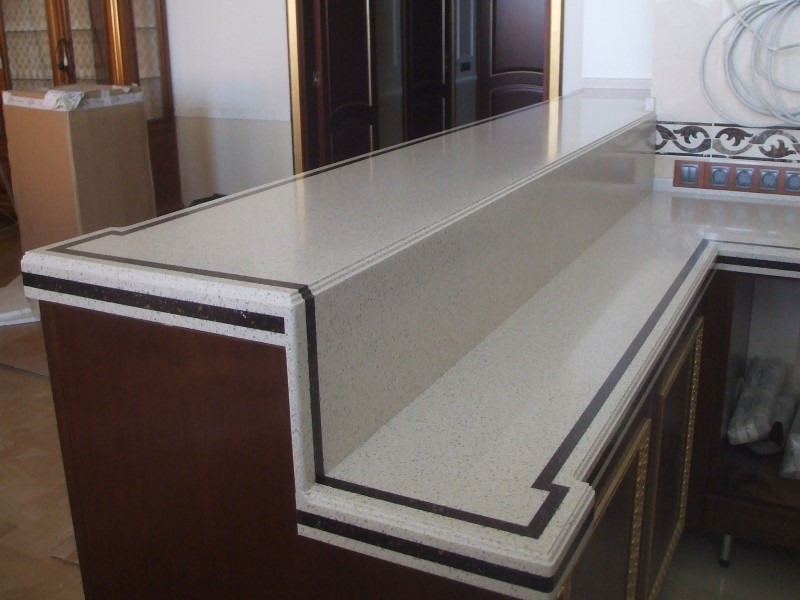 Выполняясь из синтетического камня, барная столешница для кухни отличается прекрасными эстетическими и практическими качествами. Такая поверхность не боится агрессивных внешних воздействий и отличаются высокими показателями гигиеничности.
